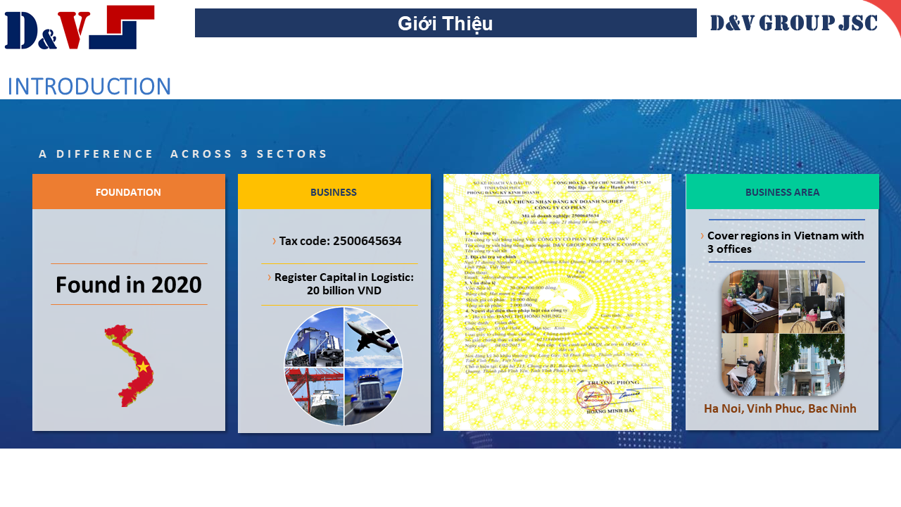 Công Ty Cổ Phần Tập Đoàn D&V là đơn vị chuyên cung cấp các dịch vụ khai báo hải quan, vận tải, vận chuyển hàng hóa trong nước và quốc tế. Là doanh nghiệp trẻ khởi nghiệp theo xu thế hội nhập chung của nền kinh tế thị trường, Công Ty Cổ Phần Tập Đoàn D&V rất mong có được sự tin tưởng của Quý khách hàng trong việc lựa chọn sử dụng và giới thiệu dịch vụ. Cùng với những nỗ lực đóng góp không ngừng của các cán bộ, công nhân viên trong công ty, Công Ty Cổ Phần Tập Đoàn D&V mong muốn tạo ra và khẳng định thương hiệu với bản sắc riêng, đồng thời qua đó đóng góp một phần sức lực vào quá trình hội nhập quốc tế của đất nước trong các lĩnh vực: